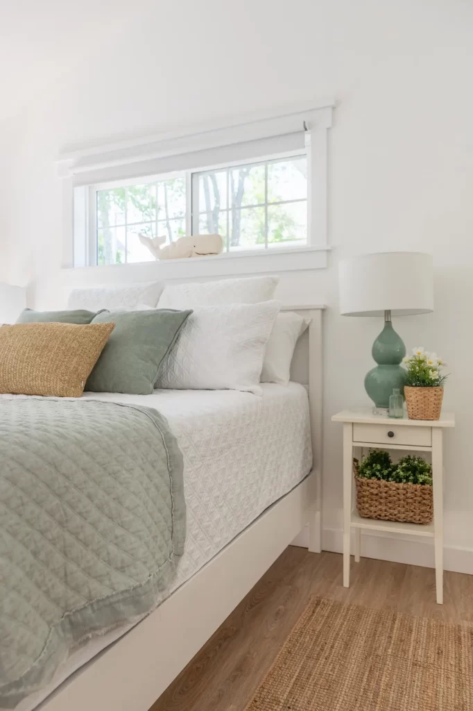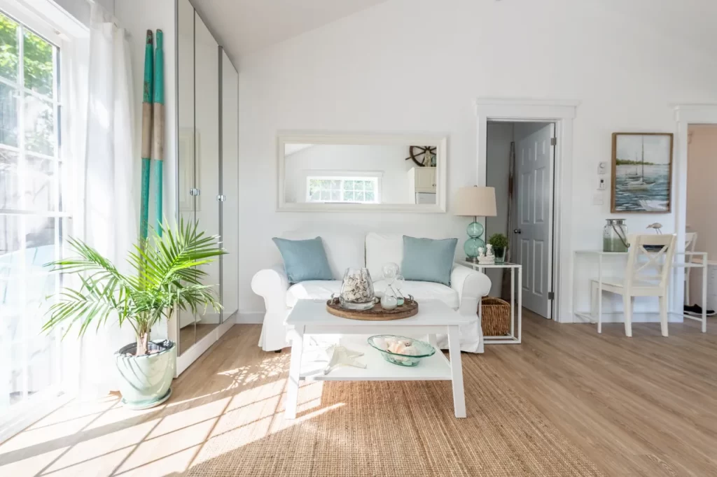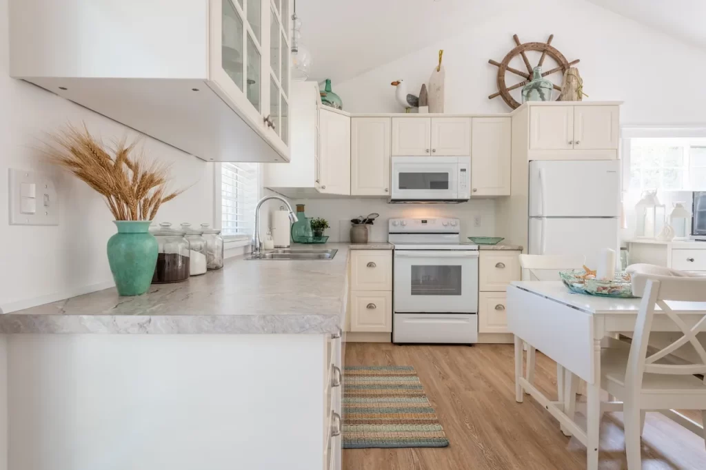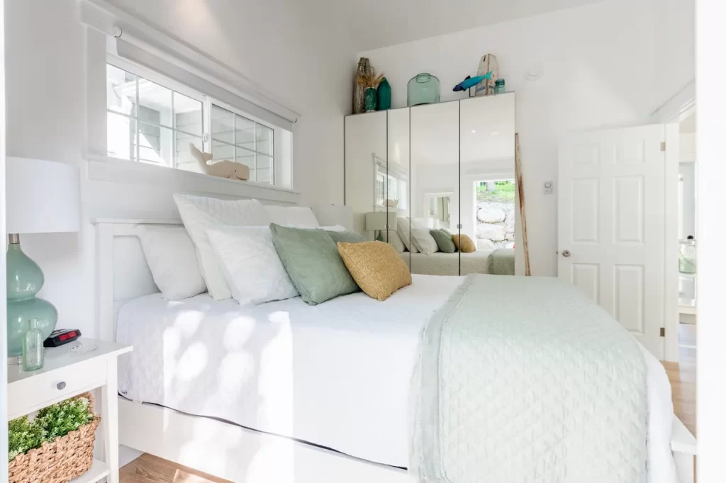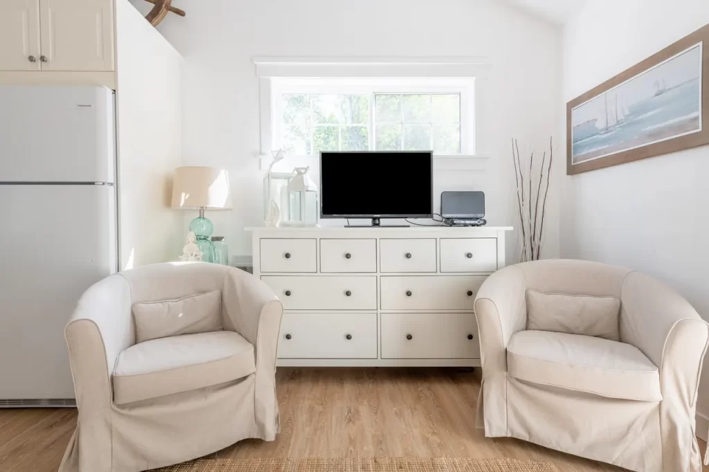 The Getaway by the Bay vacation spot is perfect for couples seeking to create new memories. The morning brings natural light through the windows, luxurious linens, and a queen-size bed. Outside, a sitting area offers the perfect place to enjoy your morning coffee and conversation.